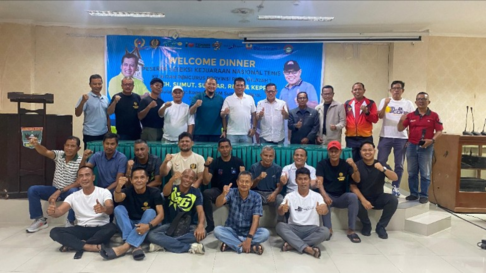 Para peserta Seleksi Kejurnas KU16 dan Pengurus Pelti Wilayah I berpose usai acara Welcome Dinner, Minggu (1/12/2024).