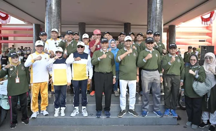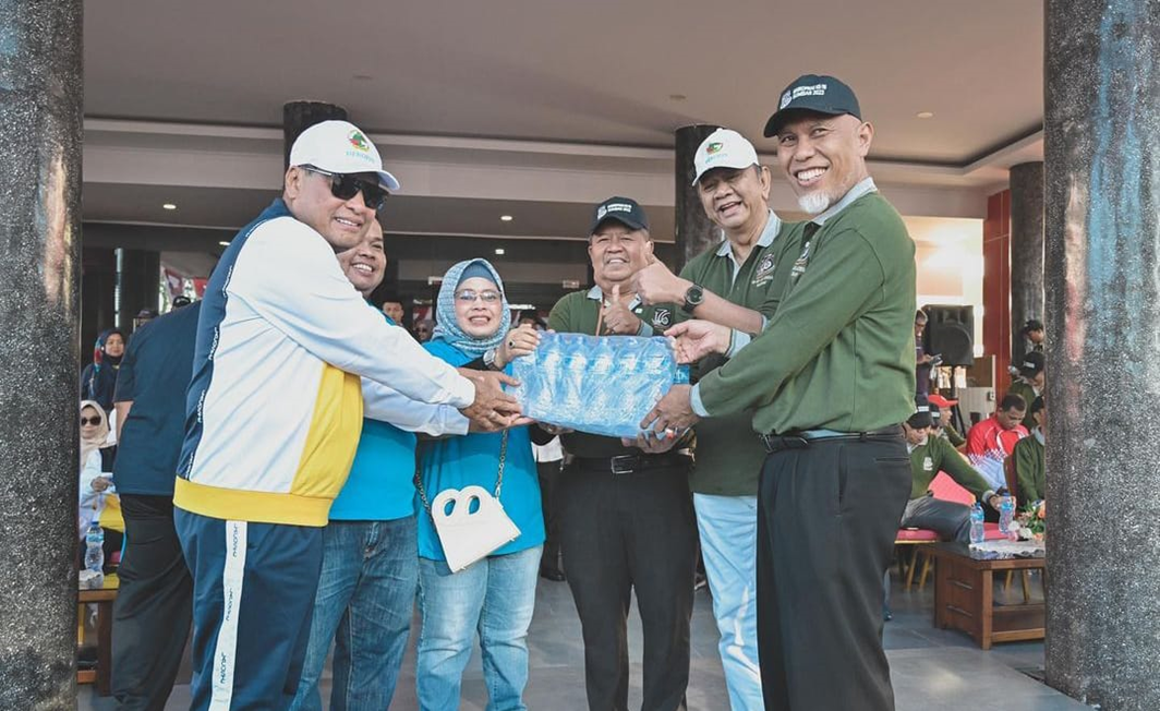 Gubernur Sumatera Barat Mahyeldi Mahyeldi Ansharullah (kedua dari kiri) dan Ketua Umum Dekopin Nurdin Halid (ketiga dari kiri) mengikuti kegiatan Jalan Sehat Hari Koperasi ke-76 di Kota Padang, Sumatera Barat, Sabtu (22/7/2023).